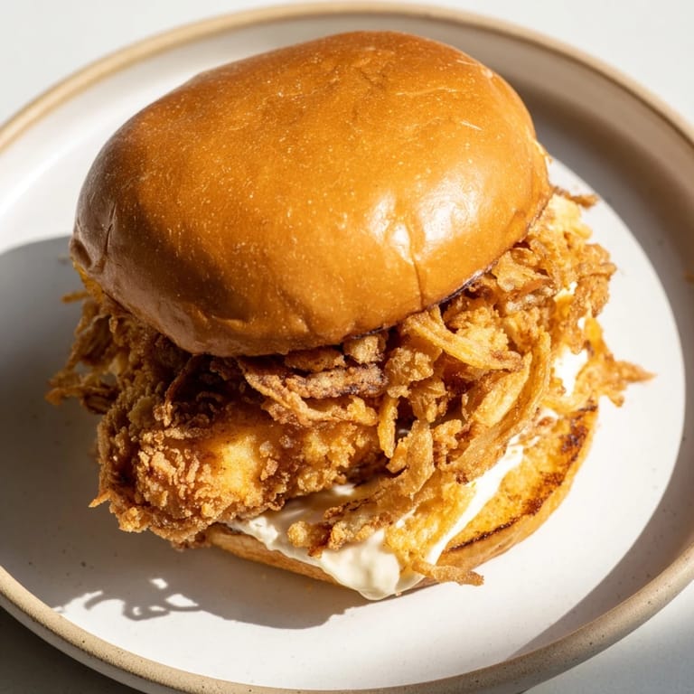 Save My neighbor knocked on my door one Saturday holding a greasy paper bag and grinning like she'd just won something. Inside was this ridiculous sandwich: fried chicken buried under a haystack of crispy onions, sauce dripping everywhere. She refused to tell me where she got it, just said I had to figure it out myself. That challenge kept me up that night, replaying every bite in my head until I wandered into my kitchen at dawn still in pajamas, determined to crack it.