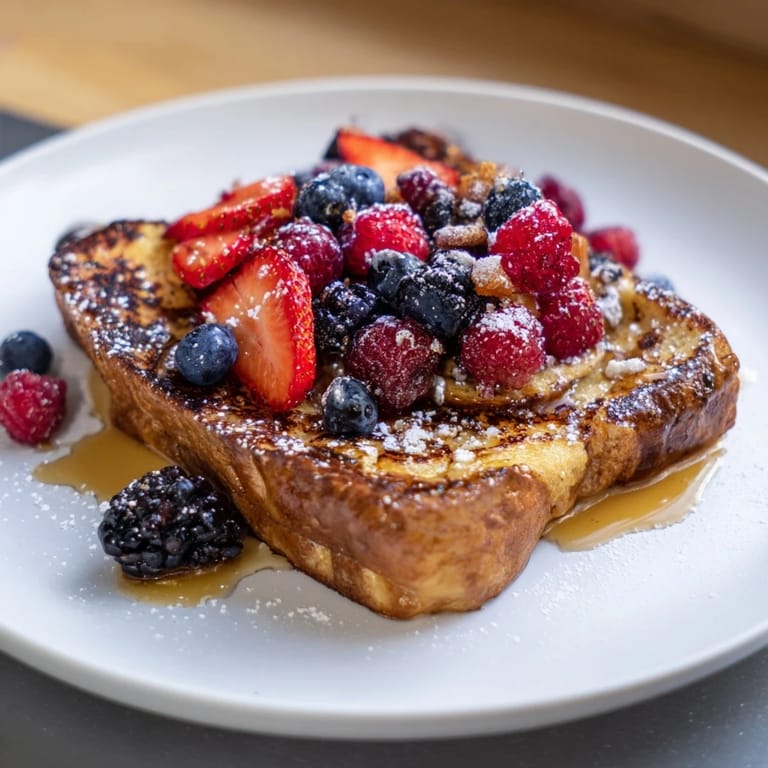- Arrange French toast slices on plates Top generously with fresh berries, drizzle with maple syrup, and dust with powdered sugar if desired.