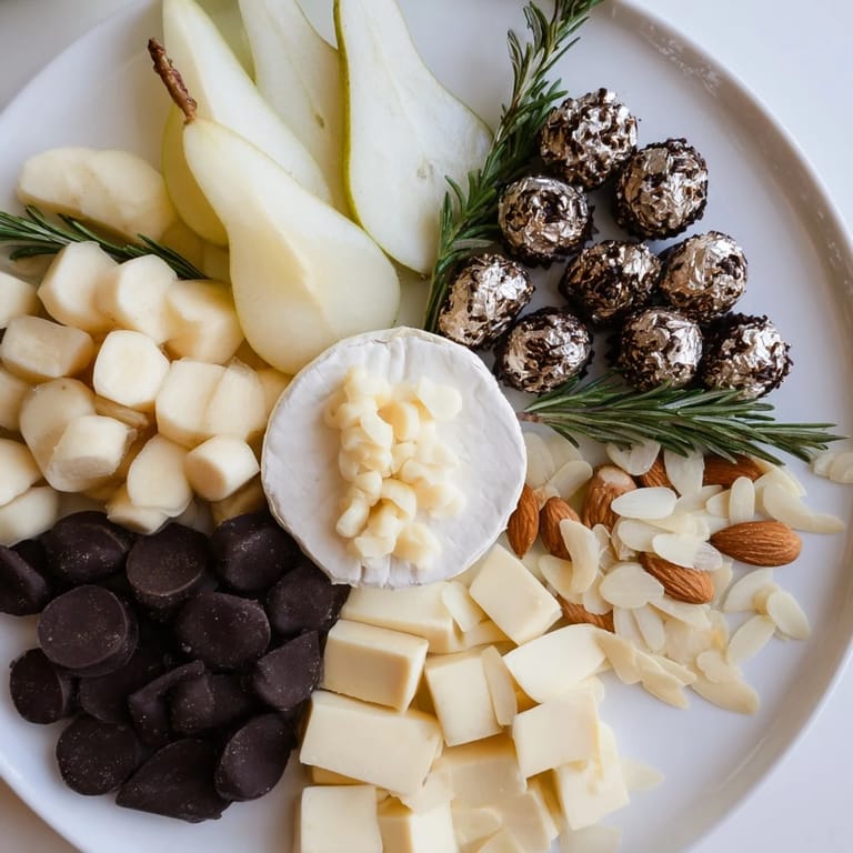 - Silver-wrapped dark chocolate truffles (100 g): The visual anchor of the whole board; dark chocolate cuts through the richness of the cheeses in the best way.